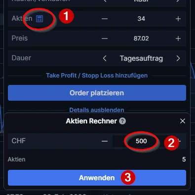 Bei der Saxo Bank musst du die Anzahl Aktien eingeben, nicht den zu investierenden Kaufbetrag. Möchtest du also 500 Franken investieren und ein Anteil kostet 100 Franken, gibst du 5 ein. Um dir diese Rechnung zu vereinfachen, hat Saxo einen Aktienrechner eingebaut. Dazu klickst du auf das Rechner-Symbol (1), gibst im Formular den Betrag ein (2) und klickst auf «Anwenden» (3). Die so berechnete Anzahl Aktien wird in den Kaufauftrag übernommen.