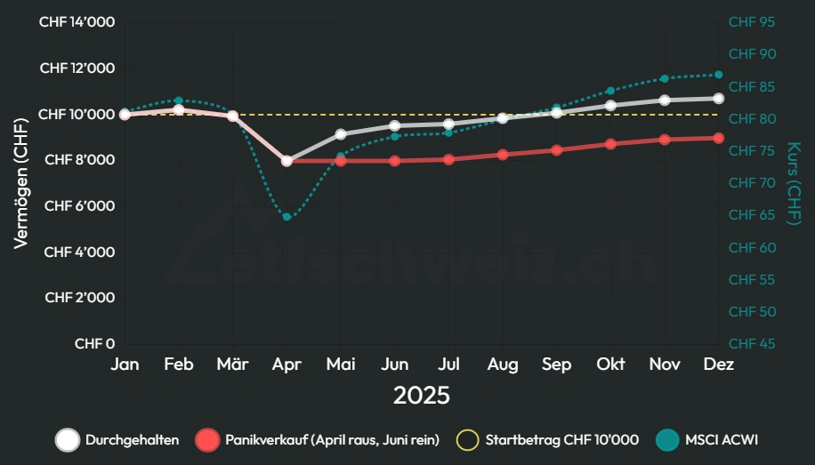 Beide investieren im Januar 10’000 CHF in denselben ETF. Im April brechen die Kurse ein – minus 20%, ausgelöst durch die Trump-Zölle. Investor A bleibt investiert. Investor B verliert die Nerven und verkauft alles, in der Angst, dass alles noch weiter sinken könnte. Auf -50% wie in den Finanzkrisen 2000 oder 2008.
